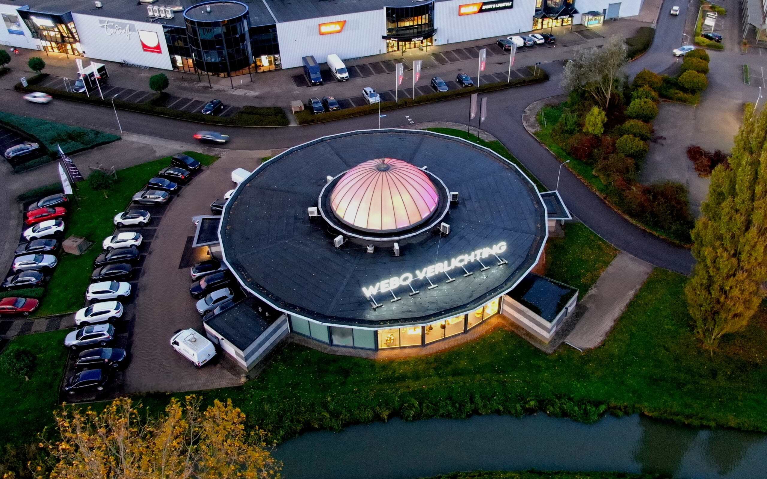Onze koepelshowroom langs de A73 in Beuningen, vlakbij Nijmegen, geniet brede bekendheid. Het is één van de grootste verlichtingsshowrooms van Nederland. ‘s Avonds kleurt de koepel in allerlei tinten — goed zichtbaar vanaf de snelweg, een sfeermaker op zich. Wie binnenloopt, wordt hartelijk ontvangen met koffie of thee en een persoonlijke benadering door mensen die écht verstand hebben van licht.