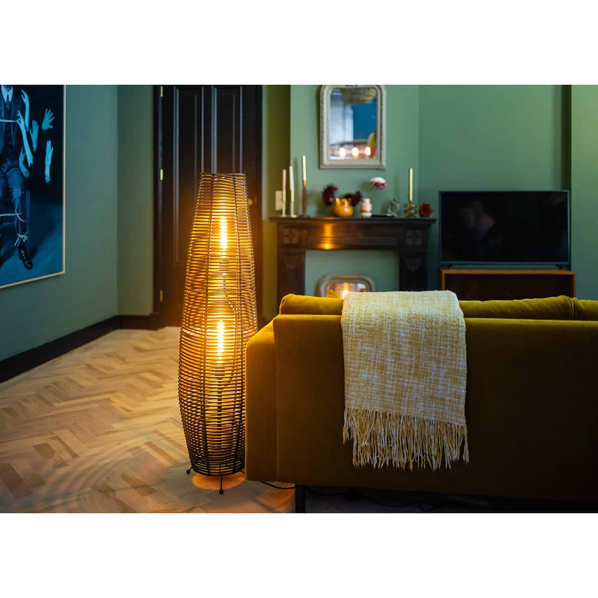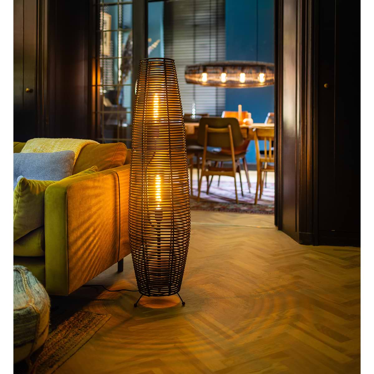 Bijzondere vloerlamp Cocoon, 2-lichts, gemaakt van Rattan, zwart, 105 cm lengte – ETH. De lamp is dimbaar via een externe wanddimmer. De serie Cocoon bevat een hanglamp, vloerlamp en tafellamp. Zoek op onze website in het zoekveld naar ‘Cocoon’.