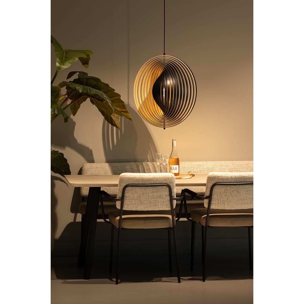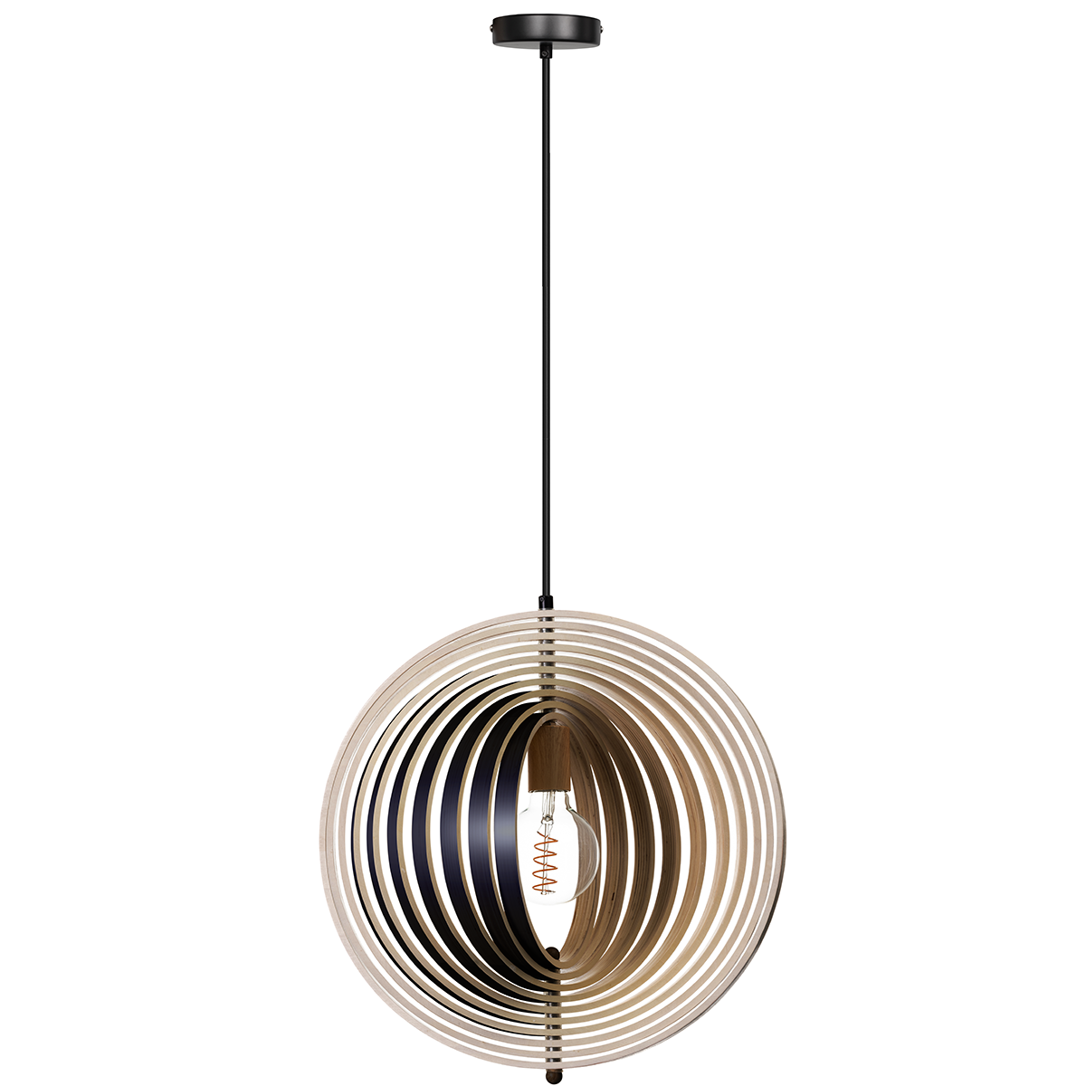 05-HL4539-3070. Bijzondere zwart/naturel houten hanglamp Woody, diameter 43,5 cm. De ringen zijn allemaal verstelbaar – ETH. De foto’s tonen aan hoe verschillend de lamp wordt door met de ringen te spelen. Binnen de Woody serie van het merk ETH zijn vier varianten. Twee verschillende afmetingen en een versie van naturel hout binnenzijde en buitenzijde en een variant met een zwarte buitenzijde en naturel houten binnenzijde. Zoek op ‘Woody’ in het zoekveld op onze website en u ziet ze allemaal.