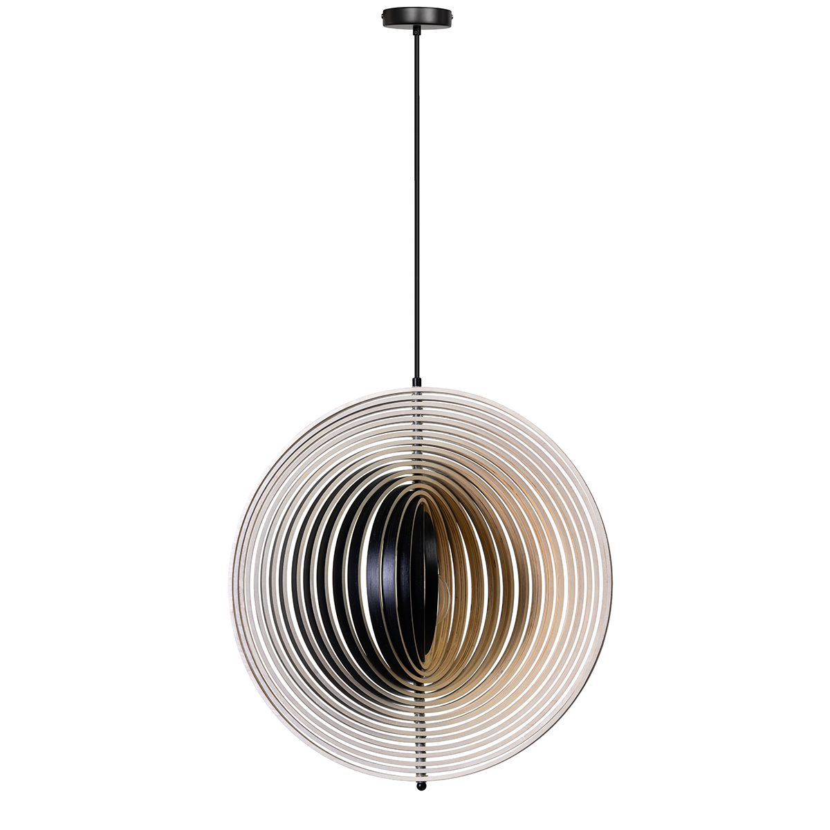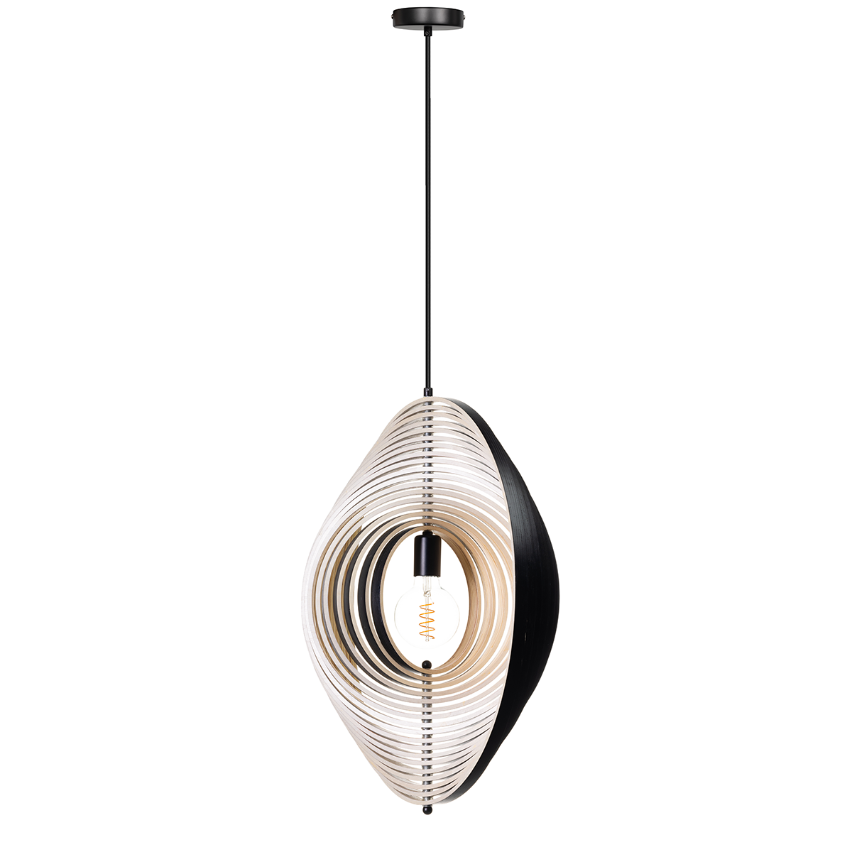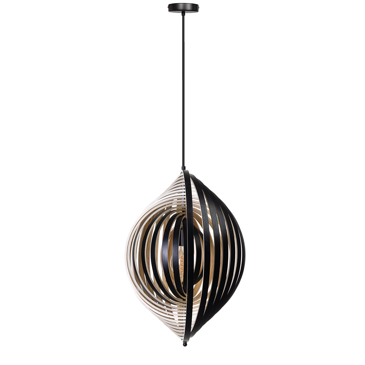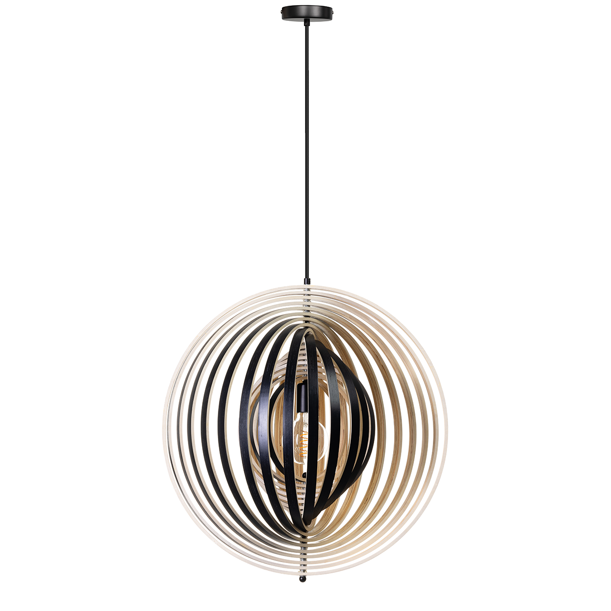 05-HL4540-3070. Bijzondere zwart/naturel houten hanglamp Woody, diameter 59 cm. De ringen zijn allemaal verstelbaar – ETH. De foto’s tonen aan hoe verschillend de lamp wordt door met de ringen te spelen. Binnen de Woody serie van het merk ETH zijn vier varianten. Twee verschillende afmetingen en een versie van naturel hout binnenzijde en buitenzijde en een variant met een zwarte buitenzijde en naturel houten binnenzijde. Zoek op ‘Woody’ in het zoekveld op onze website en u ziet ze allemaal.