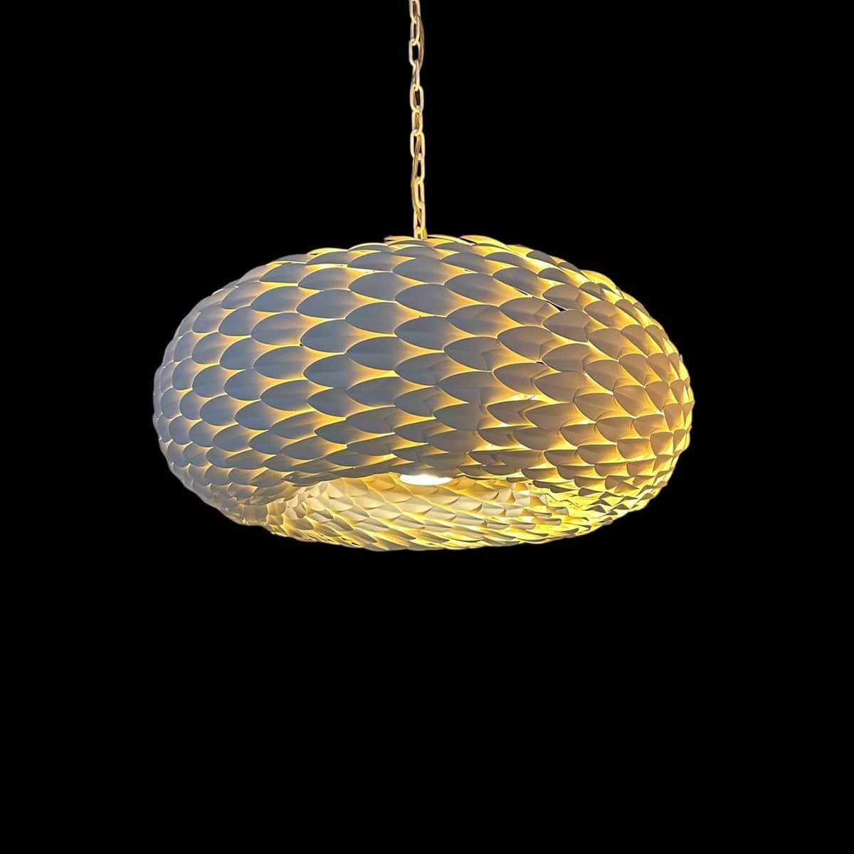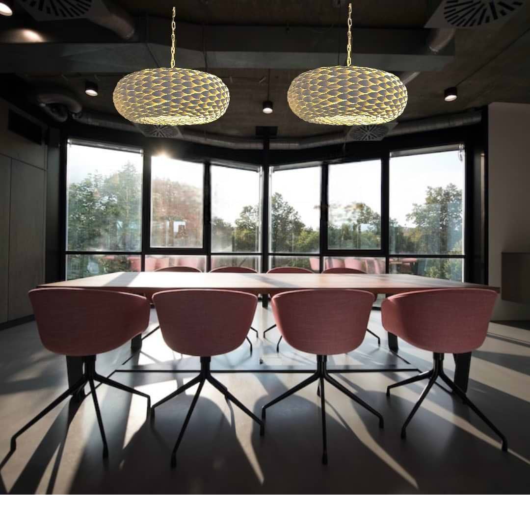 Hanglamp Coco rond, LB750/6+1R, 6-lichts plus 1 LED spot, armatuur kleur is textured-white wit. Diameter rond 63 cm, hoogte 35 cm – LECLERCQ & BOUWMAN