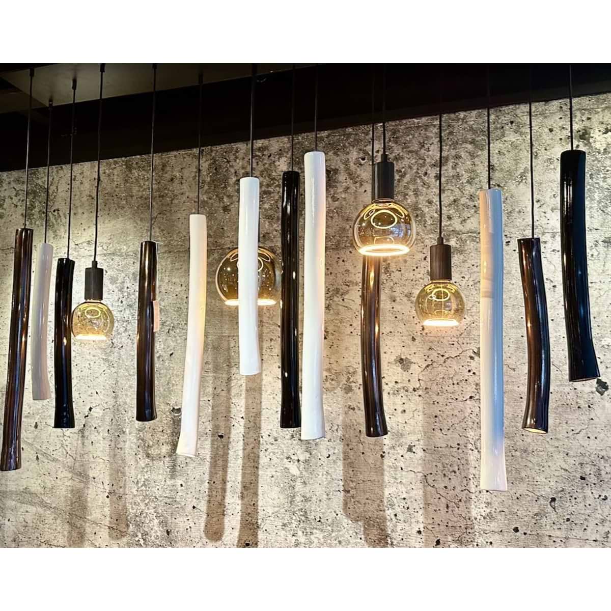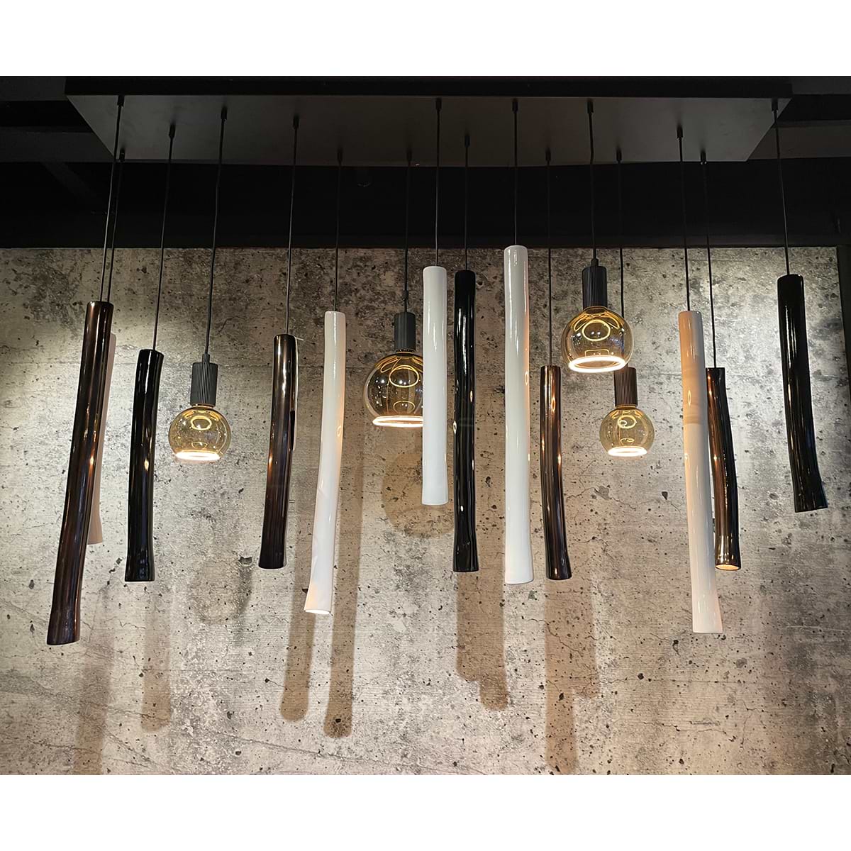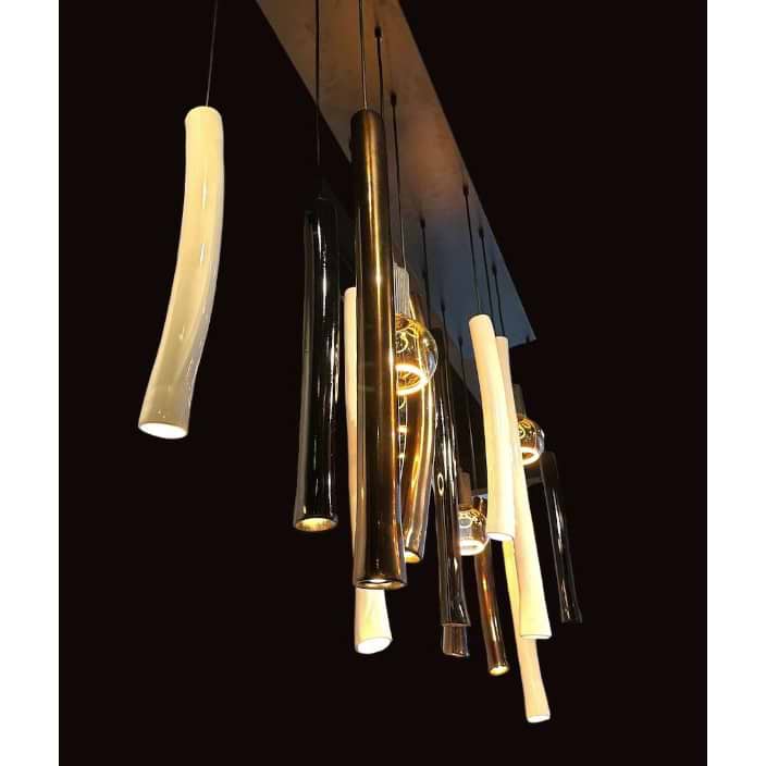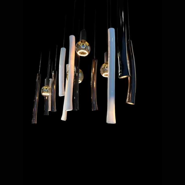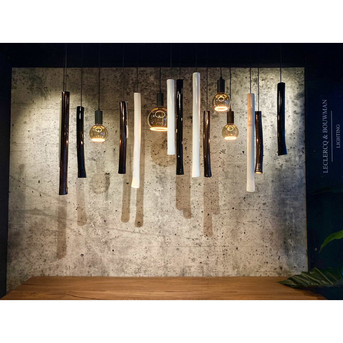 Zeer bijzondere hanglamp Forza, LB760/16, 16-lichts. Aan een zwarte plafondplaat van 160 cm, hangen 12 organisch gevormde keramische buizen in de de glanzende kleuren zwart, wit en brons. Deze versie is standaard, maar u kunt eventueel ook voor 1 of twee kleuren kiezen, de lamp is namelijk op maat samen te stellen. De keramische buizen bevatten LED Pucc spotjes die verdiept in de buis zijn bevestigd zodat u niet tegen het licht inkijkt. Deze LED Pucc spotjes worden inclusief geleverd. De 4 Segula lampen zijn verschillend van formaat op de foto. Deze Segula lampen zijn exclusief, maar u kunt ze in onze webshop erbij bestellen, zoek op Segula. Een Segula lamp is een LED-bol, dus een lichtbron, maar wel een hele bijzondere. Deze serie, de Floating Globe is grijs, smokey grey. De fitting voor de Segula bollen is E27. De afmetingen van de Forza zijn: lengte 160 cm en breedte 25 cm. De hoogte is variabel in te stellen tijdens de montage. – LECLERCQ & BOUWMAN