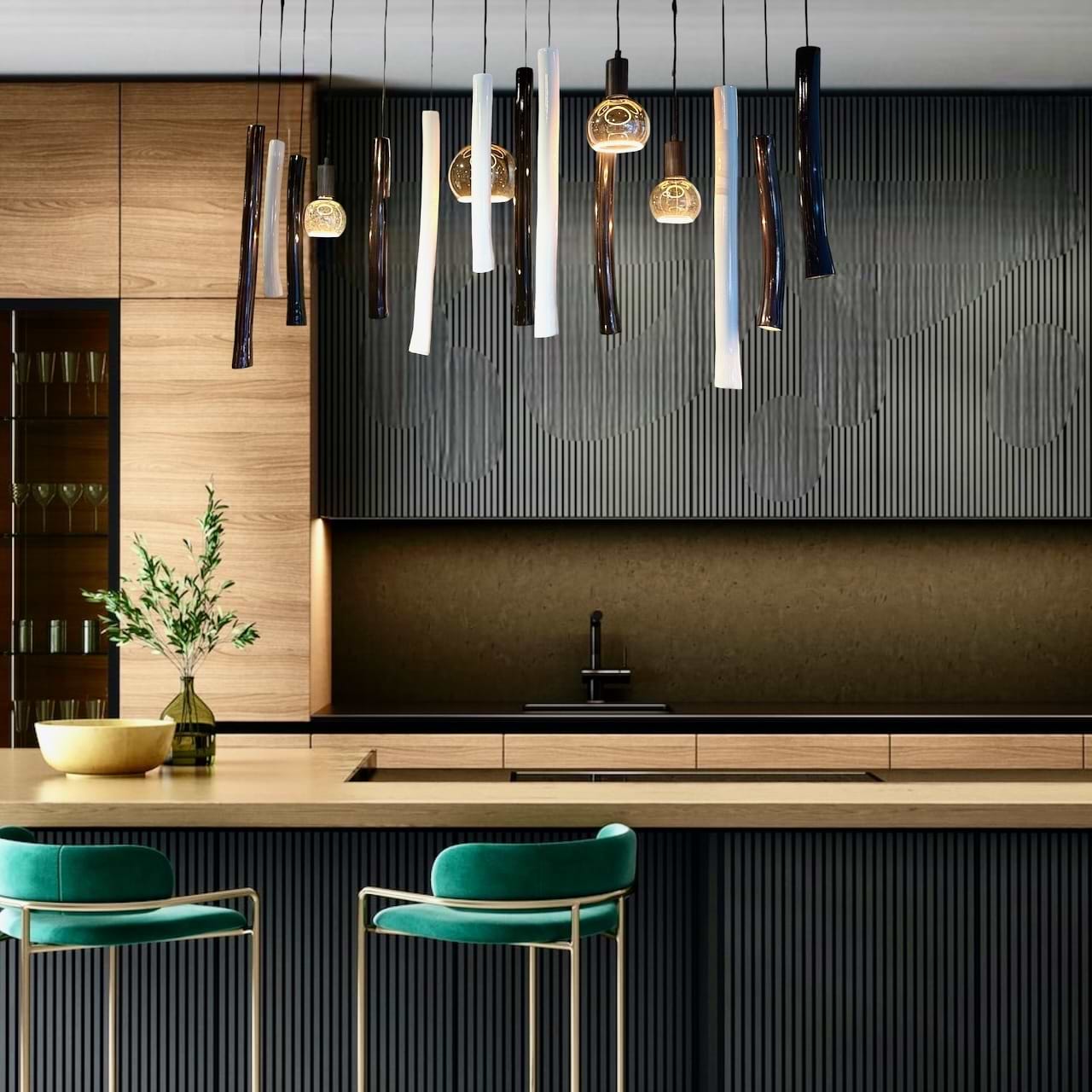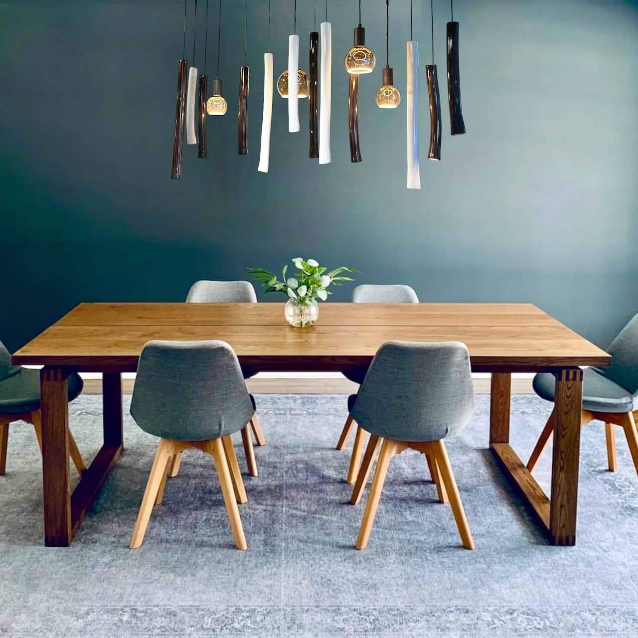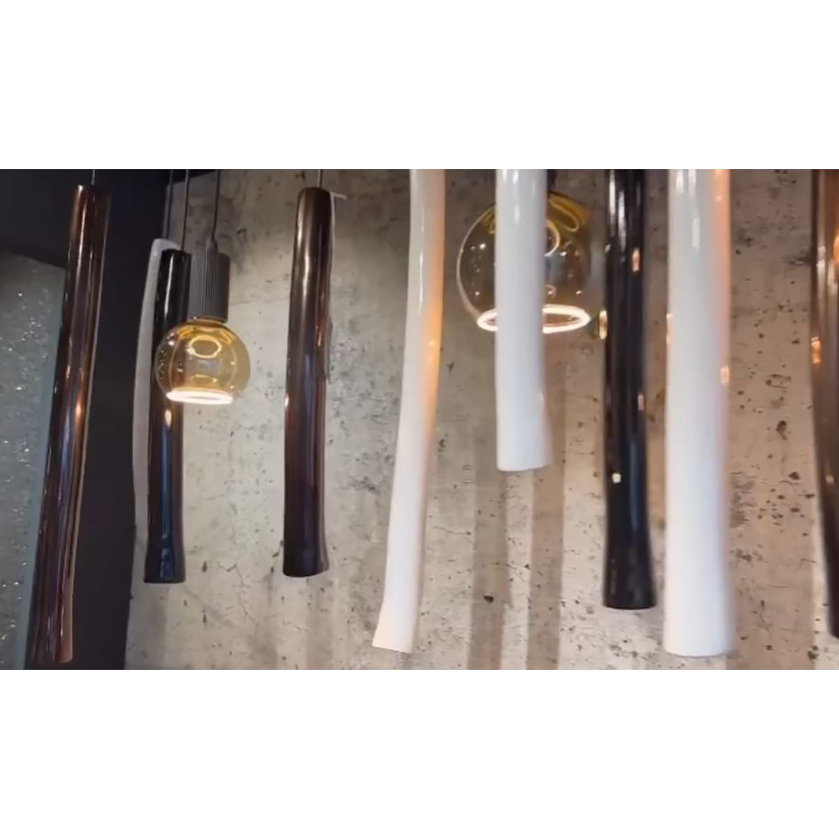 Zeer bijzondere hanglamp Forza, LB760/16, 16-lichts. Aan een zwarte plafondplaat van 160 cm, hangen 12 organisch gevormde keramische buizen in de de glanzende kleuren zwart, wit en brons. Deze versie is standaard, maar u kunt eventueel ook voor 1 of twee kleuren kiezen, de lamp is namelijk op maat samen te stellen. De keramische buizen bevatten LED Pucc spotjes die verdiept in de buis zijn bevestigd zodat u niet tegen het licht inkijkt. Deze LED Pucc spotjes worden inclusief geleverd. De 4 Segula lampen zijn verschillend van formaat op de foto. Deze Segula lampen zijn exclusief, maar u kunt ze in onze webshop erbij bestellen, zoek op Segula. Een Segula lamp is een LED-bol, dus een lichtbron, maar wel een hele bijzondere. Deze serie, de Floating Globe is grijs, smokey grey. De fitting voor de Segula bollen is E27. De afmetingen van de Forza zijn: lengte 160 cm en breedte 25 cm. De hoogte is variabel in te stellen tijdens de montage. – LECLERCQ & BOUWMAN
