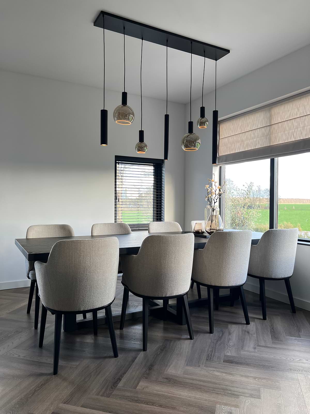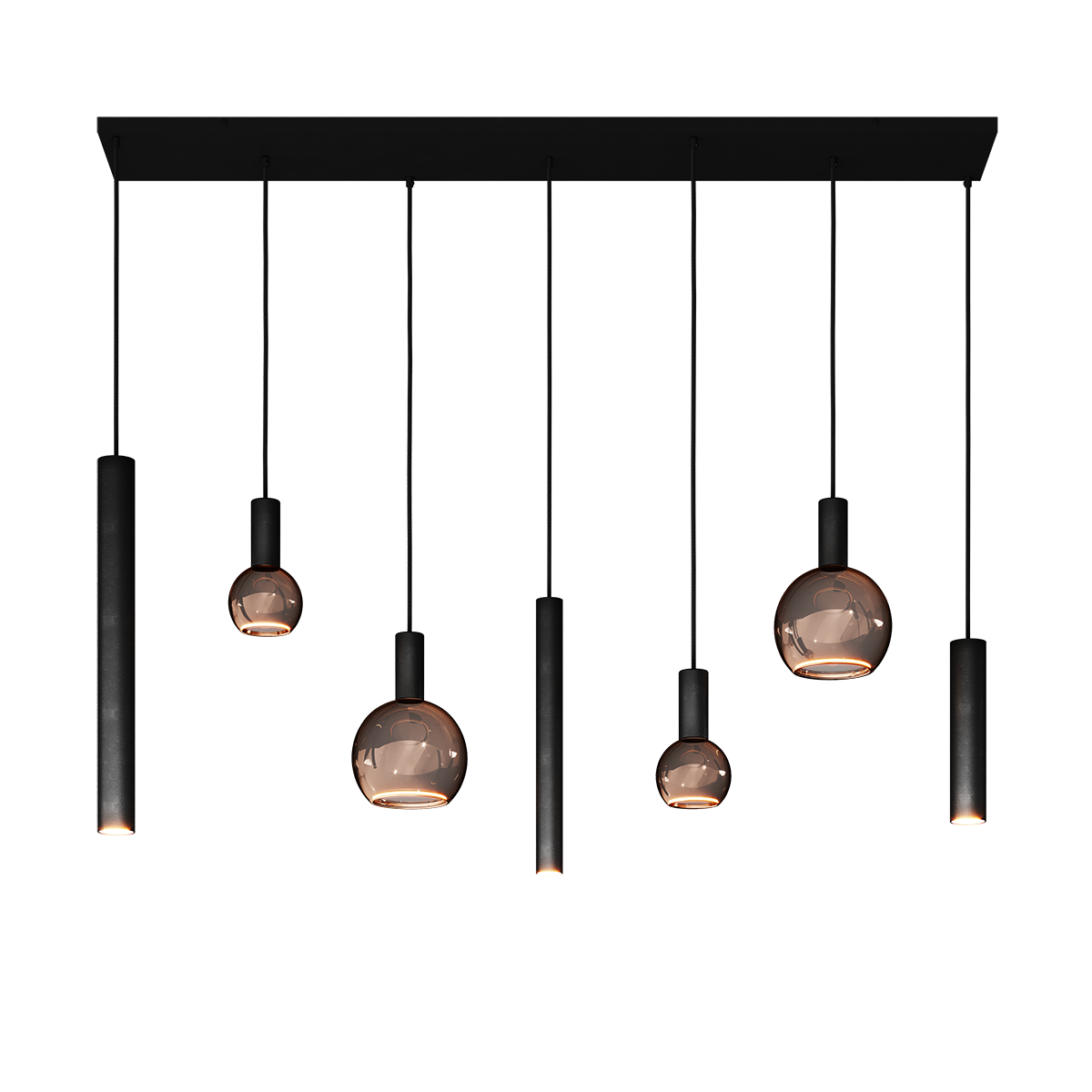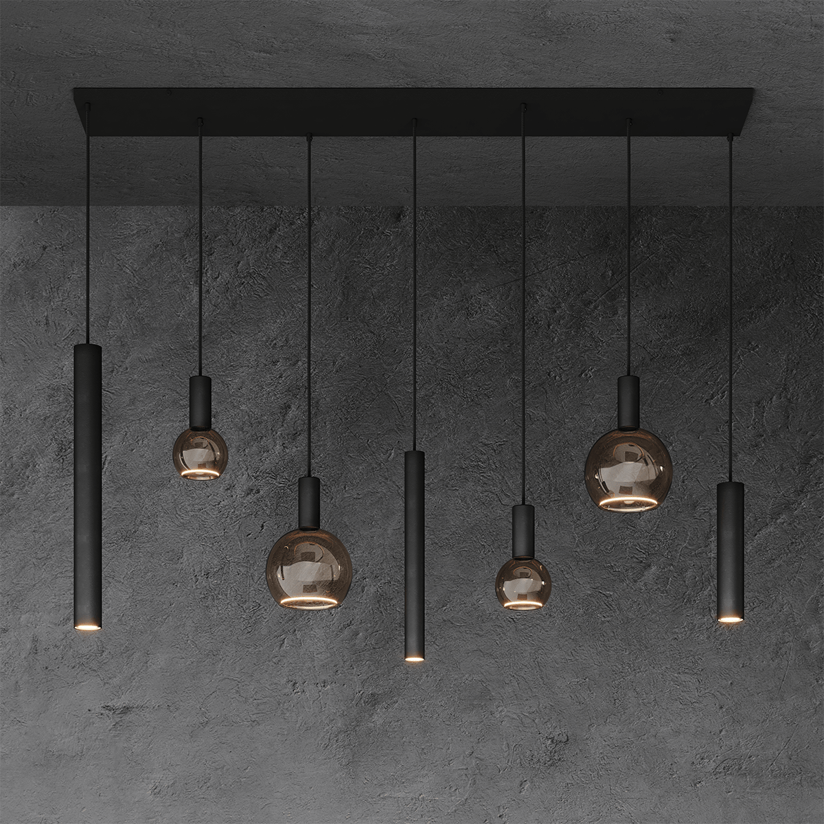 Hanglamp Riva, armatuur Ral 9005, artikelnummer 4300-9005+88805, met 7 lichtpunten. Vier fittingen E27 voor sfeer lampen en 3 fittingen GU10 voor lees licht. De prijs is inclusief de volgende lichtbronnen: 2 x Segula floating globe (99901), uitvoering 1900K / Smokey, 300 Lumen, 6 Watt, afmeting Ø200mm / 230 mm, E27 fitting, 2 x Segula floating globe (99900), uitvoering 1900K / Smokey, 220 Lumen, 6 Watt, afmeting Ø125mm / 165 mm, E27 fitting, 2 x Lybardo LED GU10 50 mm spot (99905), uitvoering 2700K / Clear, 320 lumen, 5,5 Watt, afmeting Ø50mm / 54 mm en 1 x Lybardo LED GU10/GU11 35 mm spot (99902), uitvoering 2700K / Clear, 290 lumen, 3,6 Watt, afmeting Ø35mm / 47 mm. Wilt u de lamp exclusief lichtbronnen bestellen, zoek dan op 4300-9005. De afmeting van de lamp is 145 x 22 cm, de lengte tot de onderkant lamp is 120 cm. Deze hanglamp is gemaakt en gemonteerd in Nederland door het merk Ztahl. Voor meer opties uit de serie: Riva, kunt u de zoekfunctie gebruiken op onze site. Zoek op ‘Riva’ en zie welke andere opties er binnen de serie zijn.