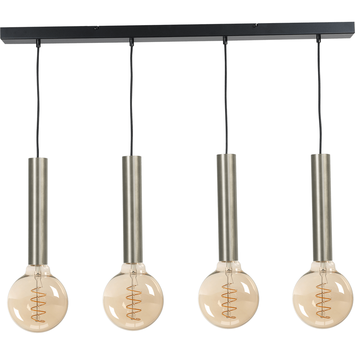 Hanglamp Tomasso 4-lichts nikkel mat, plafondplaat zwarte 100x8cm, zwarte stoffen kabel 150cm, MASTERLIGHT