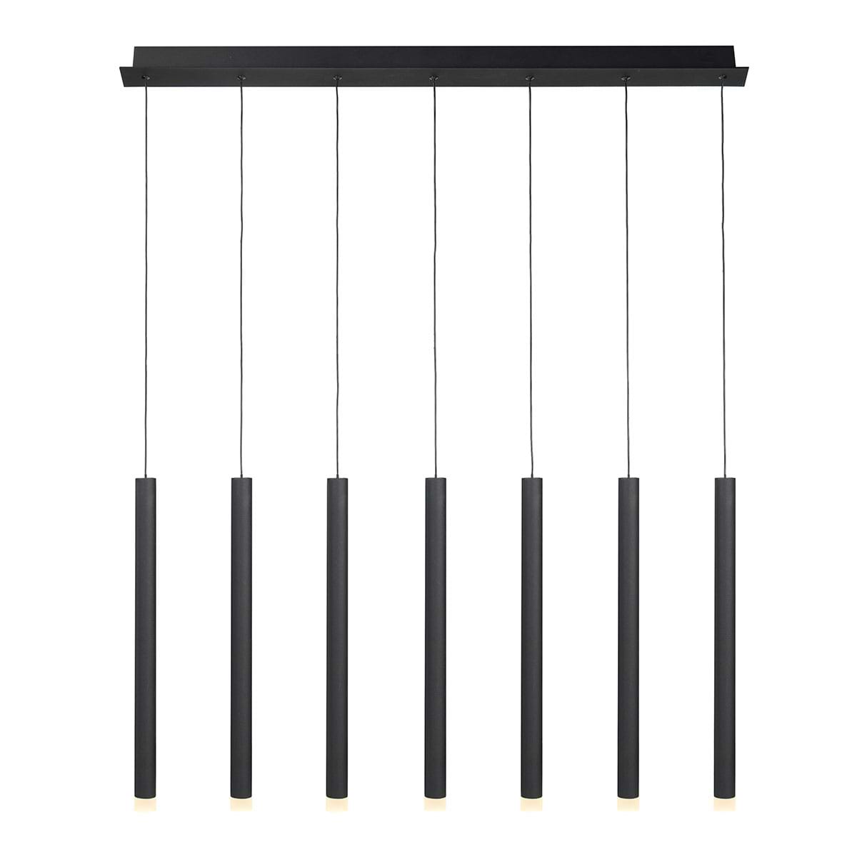 Hanglamp Tubes 7-lichts, mat zwarte dunne buizen met LED lichtbronnen, onderzijde subtiel acryl glaasje, mat zwart plafondplaat, dimbaar, HIGH LIGHT