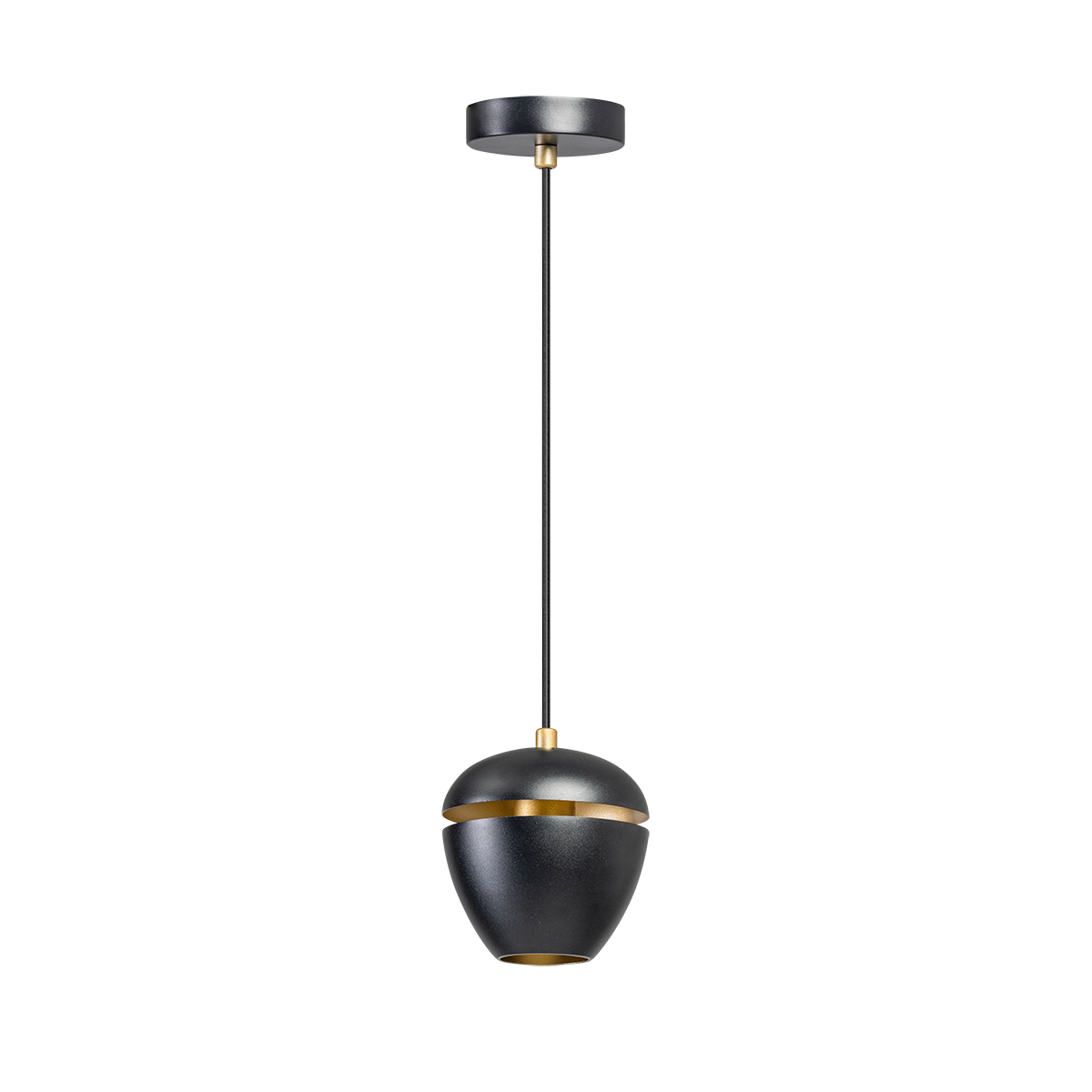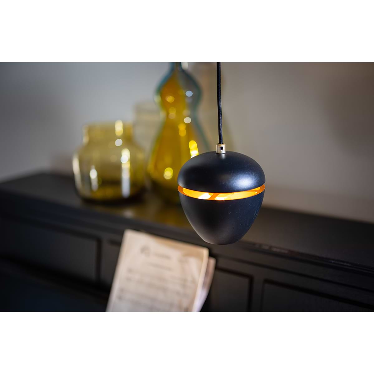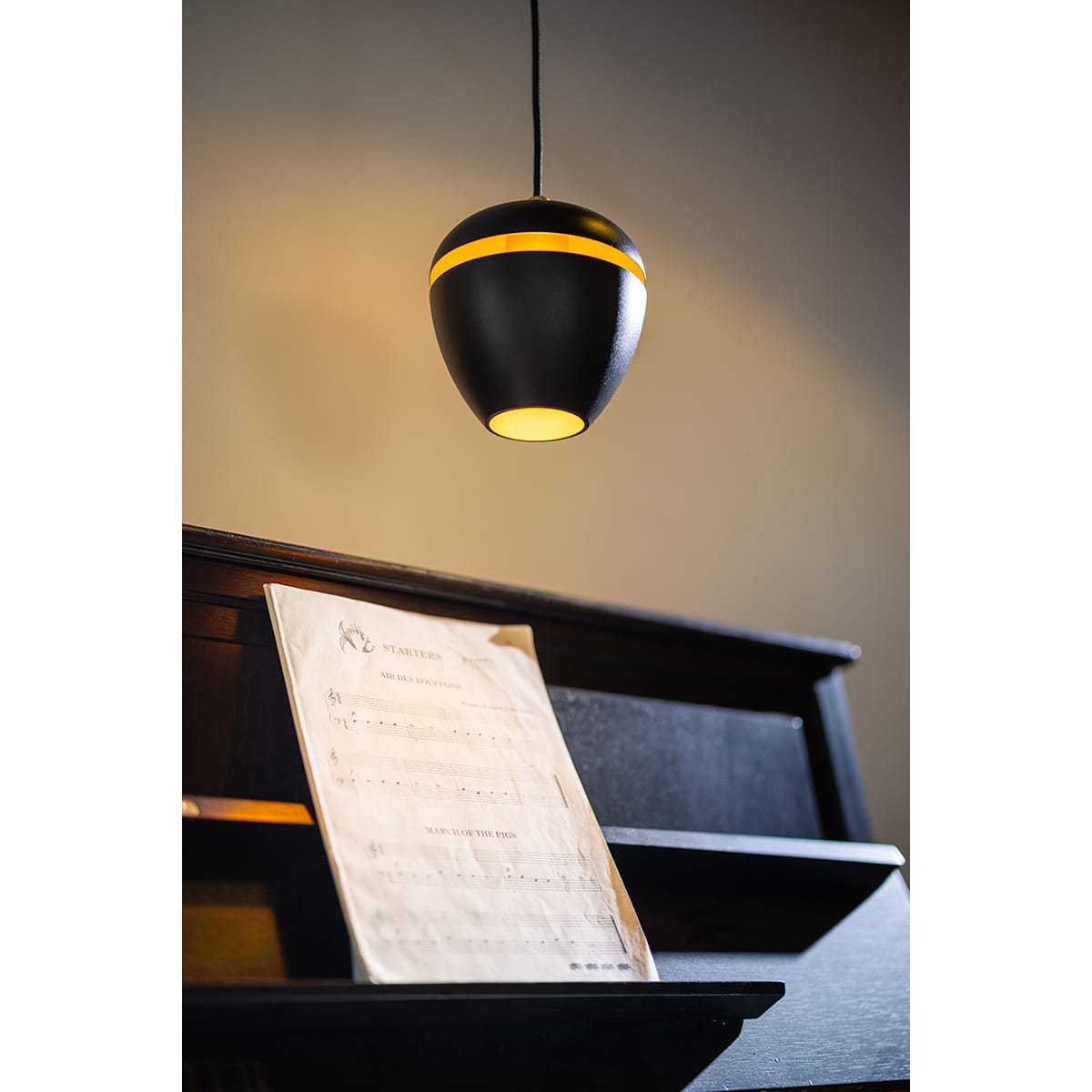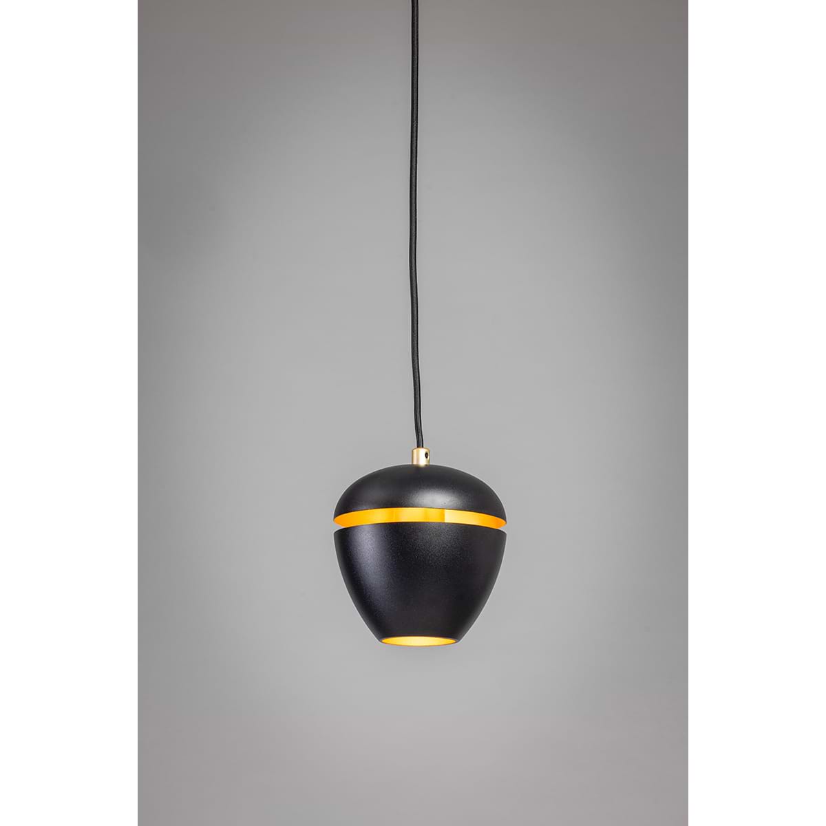 Moderne hanglamp 1-lichts, serie Claire, buitenzijde zwart, binnenzijde messing – ETH. De lamp is dimbaar via een externe wanddimmer. In de serie Claire zitten ook andere hanglampen, tafellampen, vloerlampen en een plafondlamp. Zoek op onze website op ‘Claire’.