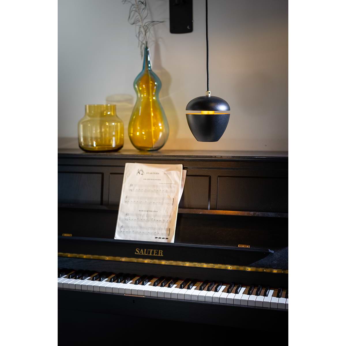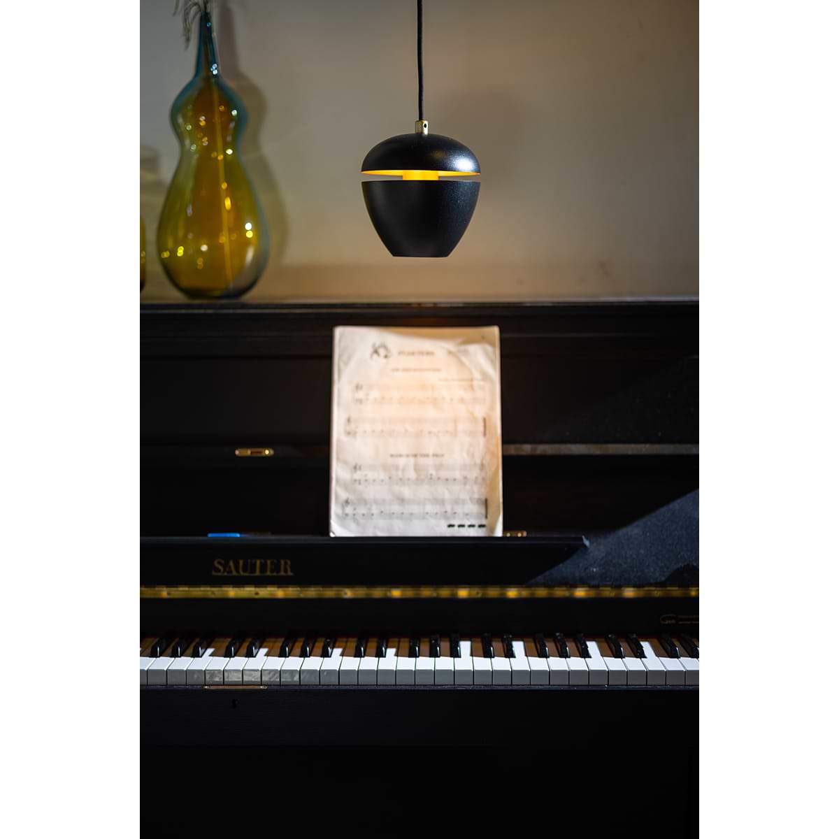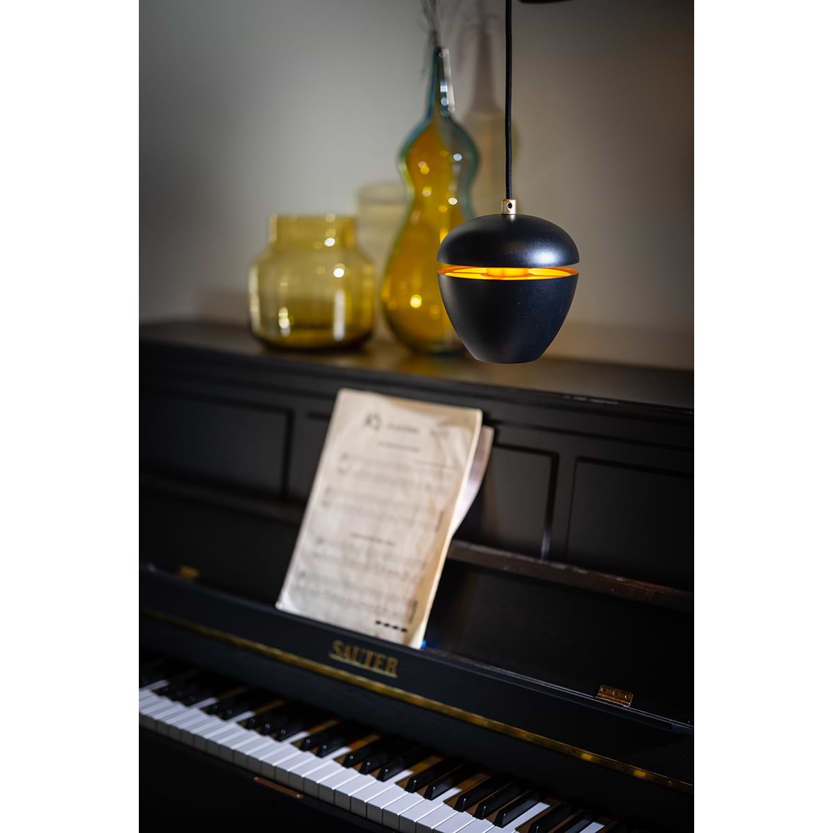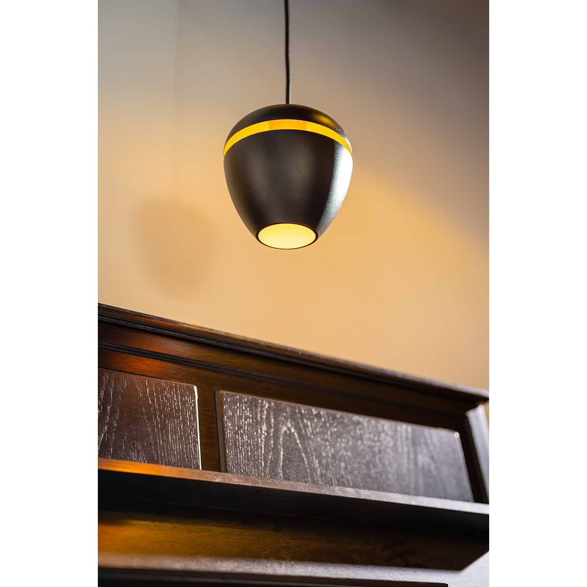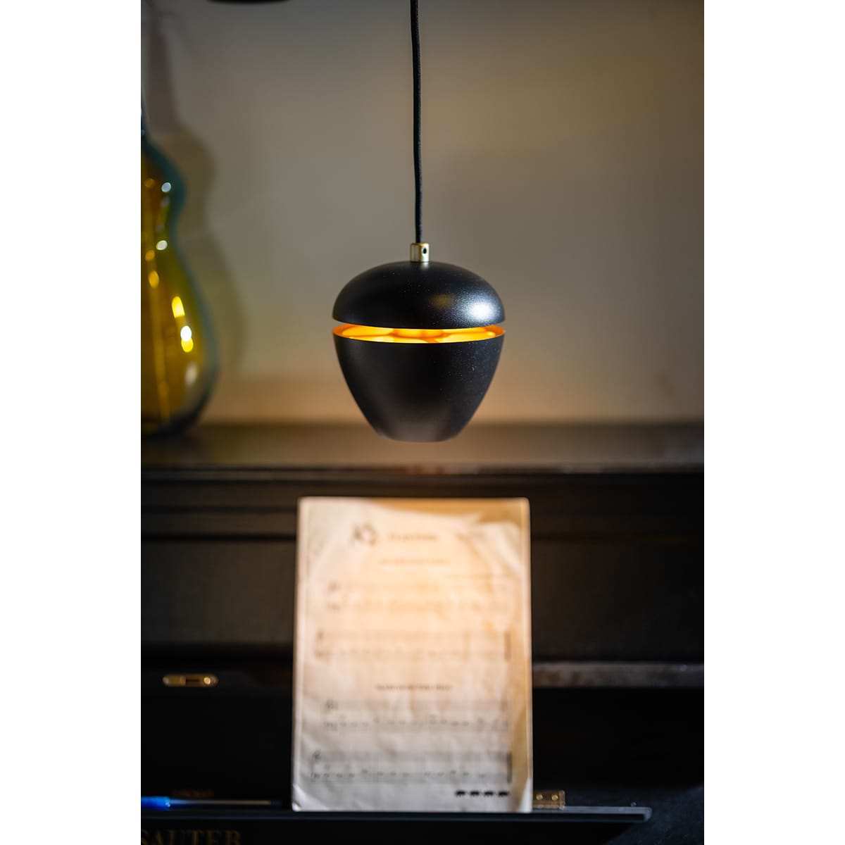 Moderne hanglamp 1-lichts, serie Claire, buitenzijde zwart, binnenzijde messing – ETH. De lamp is dimbaar via een externe wanddimmer. In de serie Claire zitten ook andere hanglampen, tafellampen, vloerlampen en een plafondlamp. Zoek op onze website op ‘Claire’.