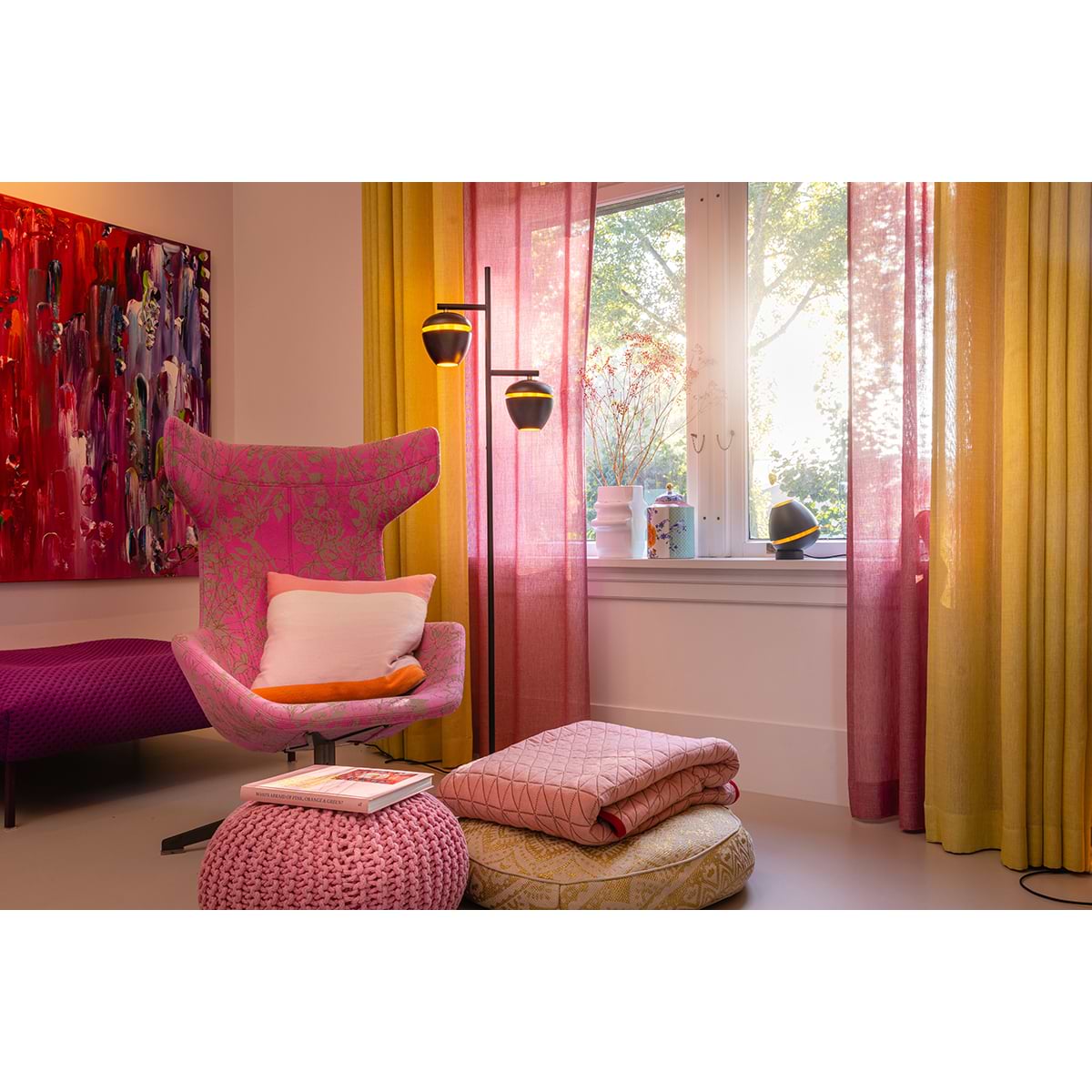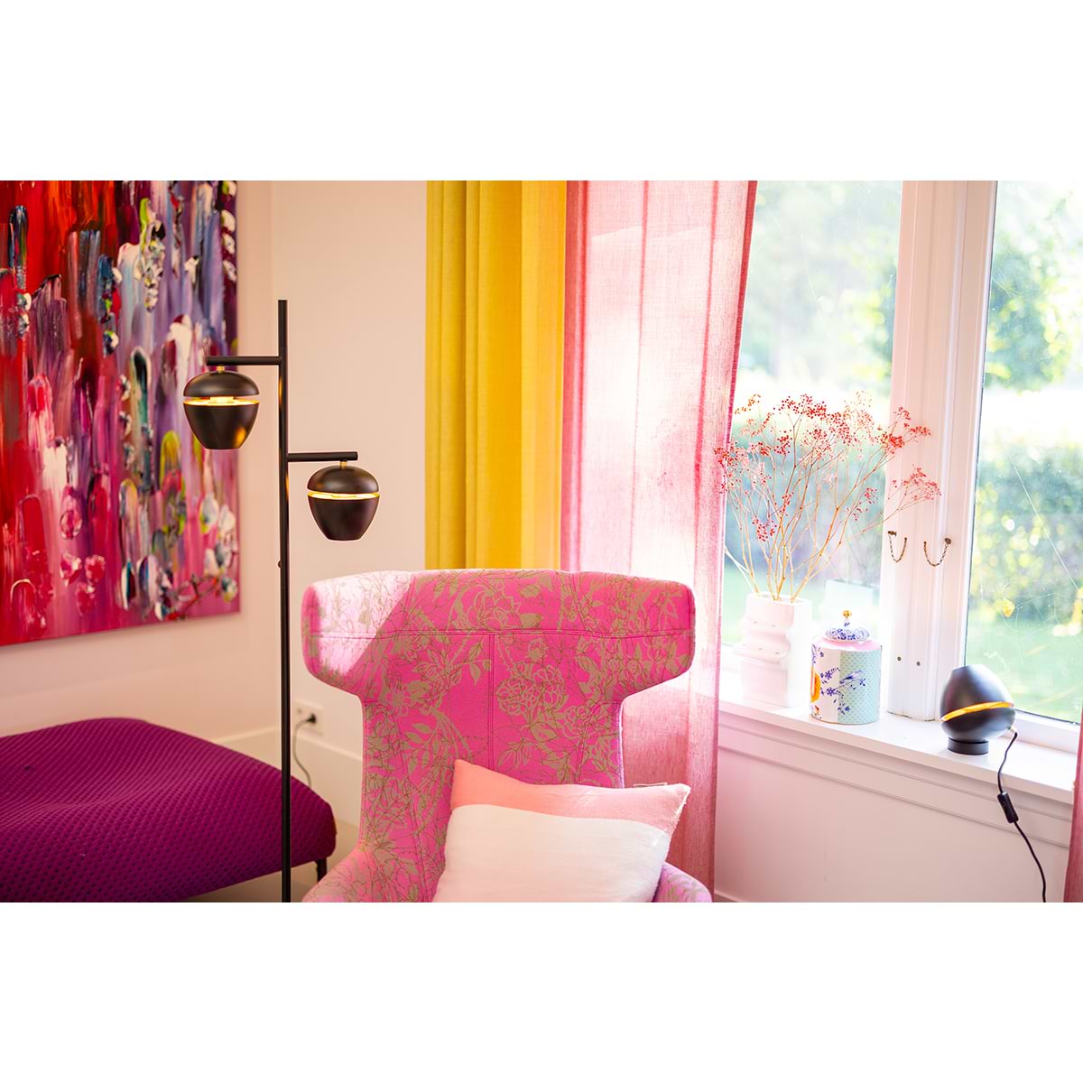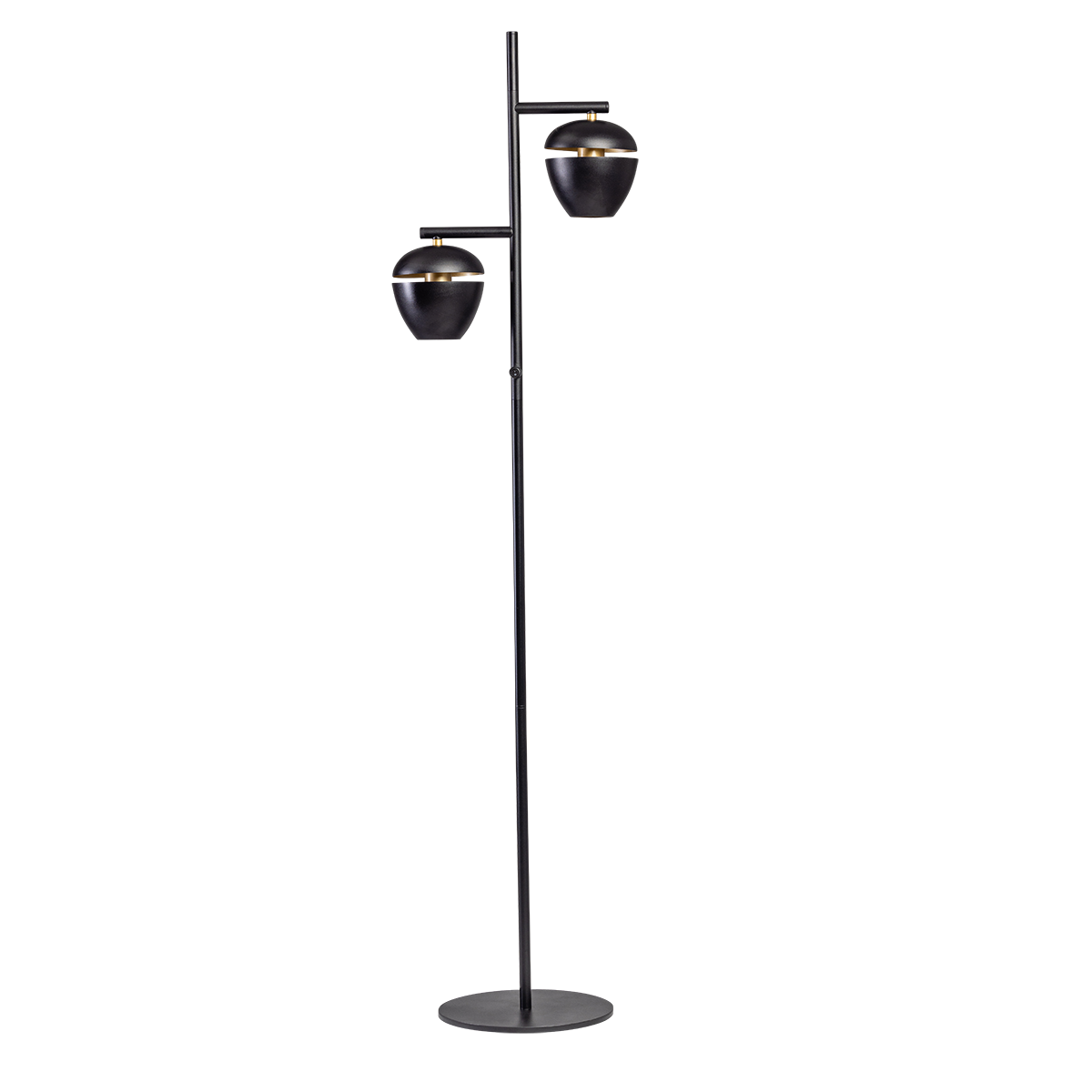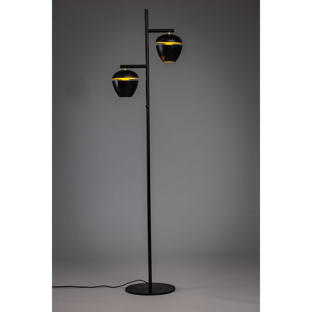 Moderne vloerlamp 2-lichts, serie Claire, buitenzijde zwart, binnenzijde messing – ETH. De lamp is dimbaar via een externe wanddimmer. In de serie Claire zitten ook andere hanglampen, tafellampen, vloerlampen en een plafondlamp. Zoek op onze website op ‘Claire’.