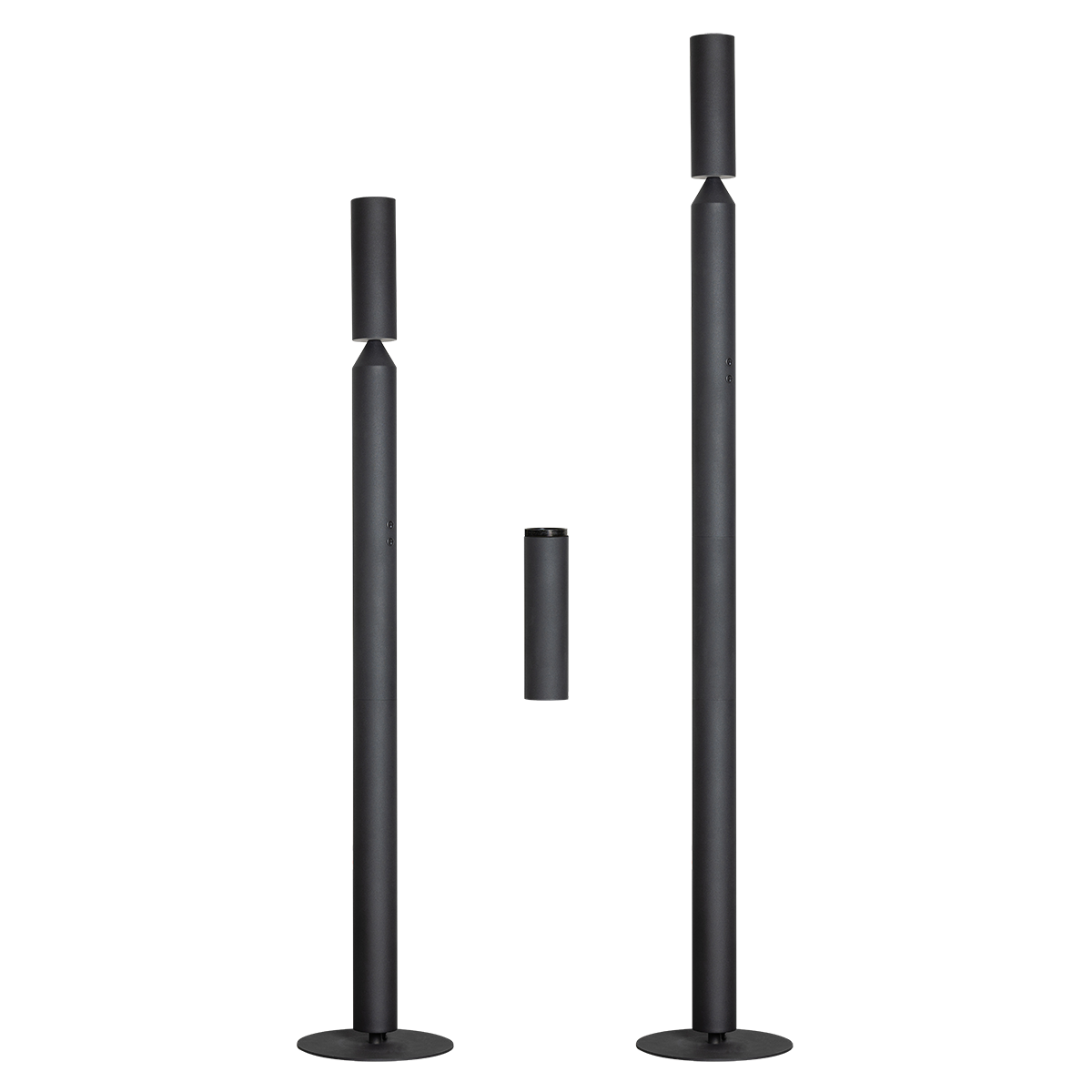 05-VL8222-30. Moderne zwarte strakke vloerlamp, Serie Pencil, 2-lichts. LED GU10 – ETH. Deze vloerlamp bevat twee LED GU10 spotjes. De ene net boven de punt schijnend naar beneden en de andere bovenin, schijnend naar boven. De lamp heeft een aan- en uitschakelaar op het armatuur. De doorsnede van het armatuur is 80mm, 8 cm. De hoogte van het armatuur is variabel door een meegeleverde extensie. U kunt zelf kiezen voor een hoogte van 1515mm oftewel 151,5 cm, of voor een hoogte van 1800mm oftewel 180 cm. De vloerplaat wordt in dezelfde kleur geleverd en heeft een doorsnede van 280mm, 28 cm en een hoogte van 5mm oftewel 0,5 cm. De Serie Pencil bevat een hanglamp, een tafellamp en een vloerlamp. Allemaal in de kleur zwart of zand.