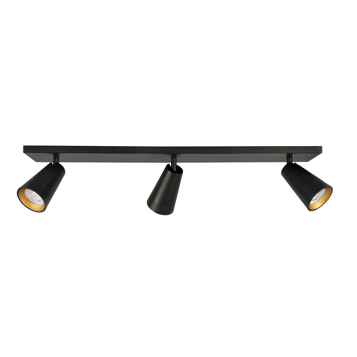 Petunia spot 3-lichts balk. De Petunia serie spots van High Light kenmerken zich door een strakke vorm en zijn allemaal volledig draaibaar en kantelbaar. De buitenzijde van de spots is mat zwart en de binnenzijde mat goud. De fitting is GU10 LED. De spot wordt geleverd zonder lichtbronnen, maar in de spots passen vervangbare GU10 lichtbronnen van maximaal 35 Watt, LED. Ook de Philips HUE lichtbronnen passen in deze spots. De lichtbron komt iets verdiept in de spot te zitten wat een mooi resultaat geeft met het mat goud van de binnenzijde. De plafondplaat heeft een lengte van 65 cm en een breedte van 9,5 cm. De plafondplaat is 2,5 cm hoog. De spot zelf heeft een lengte van 8 cm en een diameter van 5,8 cm. De totale hoogte van de spot is 13 cm. De spot is ook dimbaar te maken met een externe wanddimmer (exclusief). In de Petunia serie bevinden zich ronde 1, 2 en 3 lichts spots en 2-lichts en 3-lichts balken.