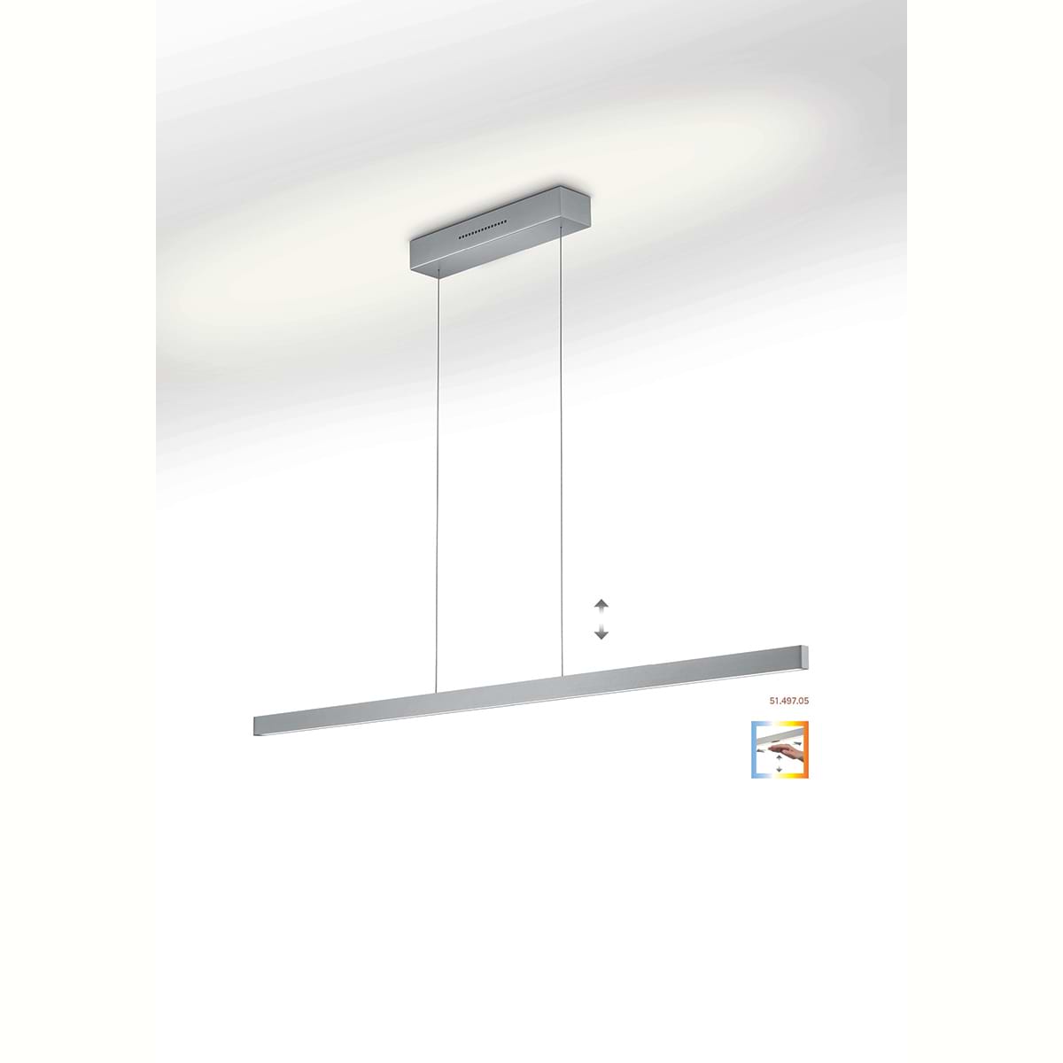 Moderne smalle design hanglamp, 51.497.05, van de Duitse fabrikant Knapstein. Direct en indirecte verlichting. Boven en onder licht zijn apart van elkaar door twee gebaarbedieningen in- en uit te schakelen en te dimmen. De lichtkleur van het boven en van het onderlicht kan door twee gebaarbedieningen apart van elkaar ingesteld worden tussen 2.200 en 3.000 Kelvin. Geheugenfunctie. De lamp is traploos in hoogte verstelbaar, bereik 1000 mm. Geen zichtbare schroeven in de plafondplaat. Alle lampen van Knapstein zijn van zeer degelijke kwaliteit. Voor meer opties uit de serie: LINDA-132, kunt u de zoekfunctie gebruiken op onze site. Dan ziet u welke andere opties er binnen de serie zijn. Kleur: nikkel mat. Aantal lichtpunten: 1. Lichtbron: inclusief. Breedte in mm: 75. Lengte/diepte in mm: 1320.