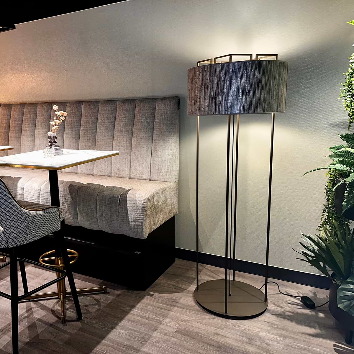 Vloerlamp Aosta, armatuur Quartz 2, artikelnummer 6100-Quartz, met lampenkap Mercury Bamboo, artikelnummer 606030-MB-Aosta, afmeting 60/60-30 cm. 170 cm hoog. Gemaakt en gemonteerd in Nederland door het merk Ztahl. Voor meer opties uit de serie: Aosta, kunt u de zoekfunctie gebruiken op onze site. Dan ziet u welke andere opties er binnen de serie zijn.