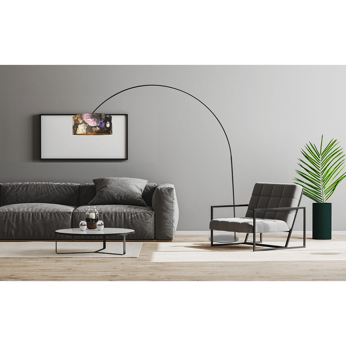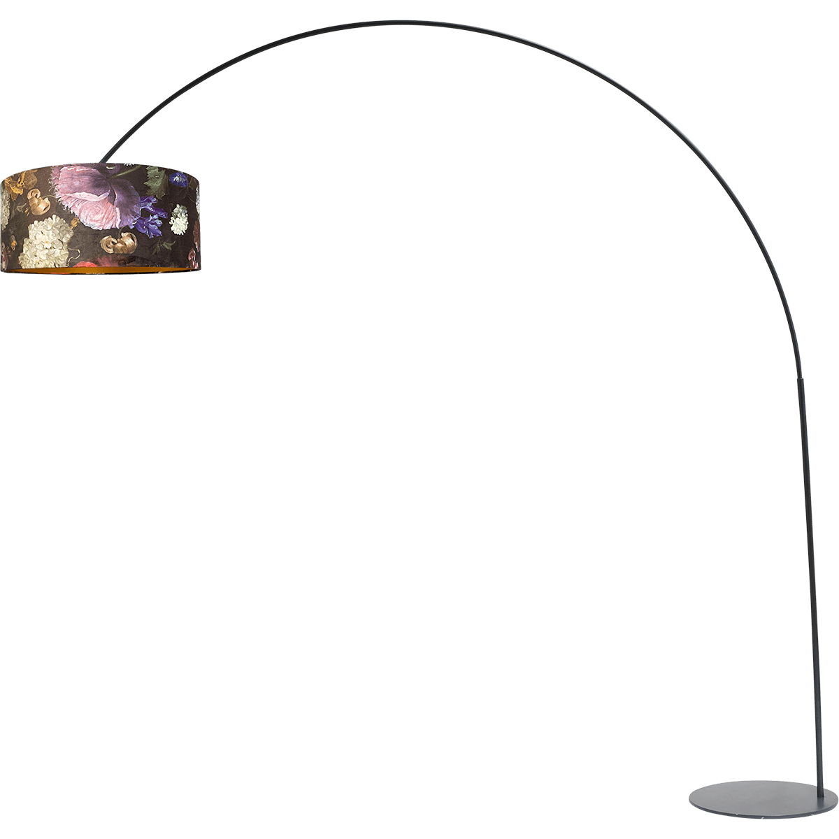 Vloerlamp, booglamp, Arch XXL matt black, mat zwart, hoogte 223 cm, breedte 217 cm, inclusief lampenkap met bloemenmotief, MASTERLIGHT